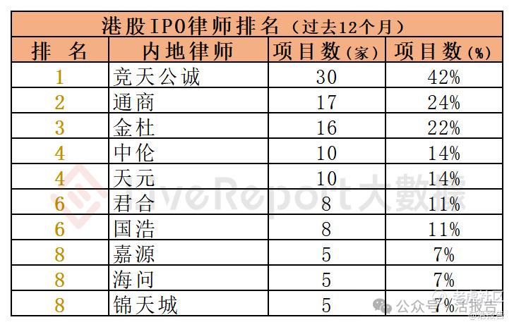 过去12个月期间,29家内地律师为72家港股IPO提供了上市法律服务,项目数量最多的内地律师:① 竞天公诚(30家);② 通商(17家)、③金杜(16家)。