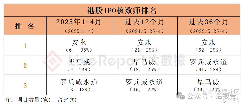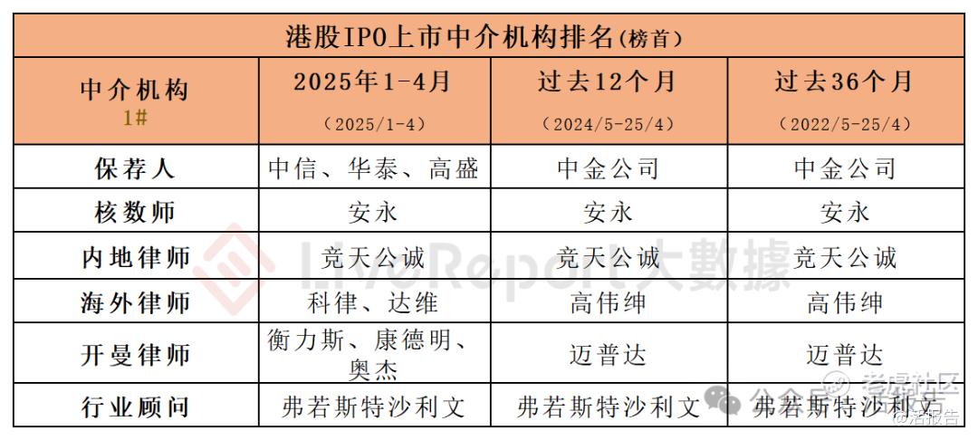香港 IPO中介排行-2025年4月:中信、华泰、高盛领跑保荐人,安永稳坐核数师第一