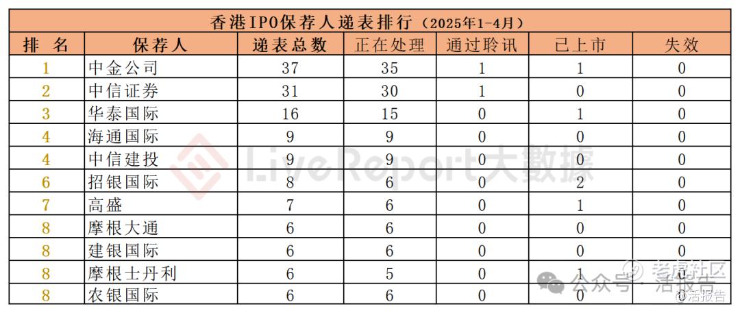 今年1-4月累计递表项目最多的保荐人有:①中金公司(37家);②中信证券(31家);③华泰国际(16家)。