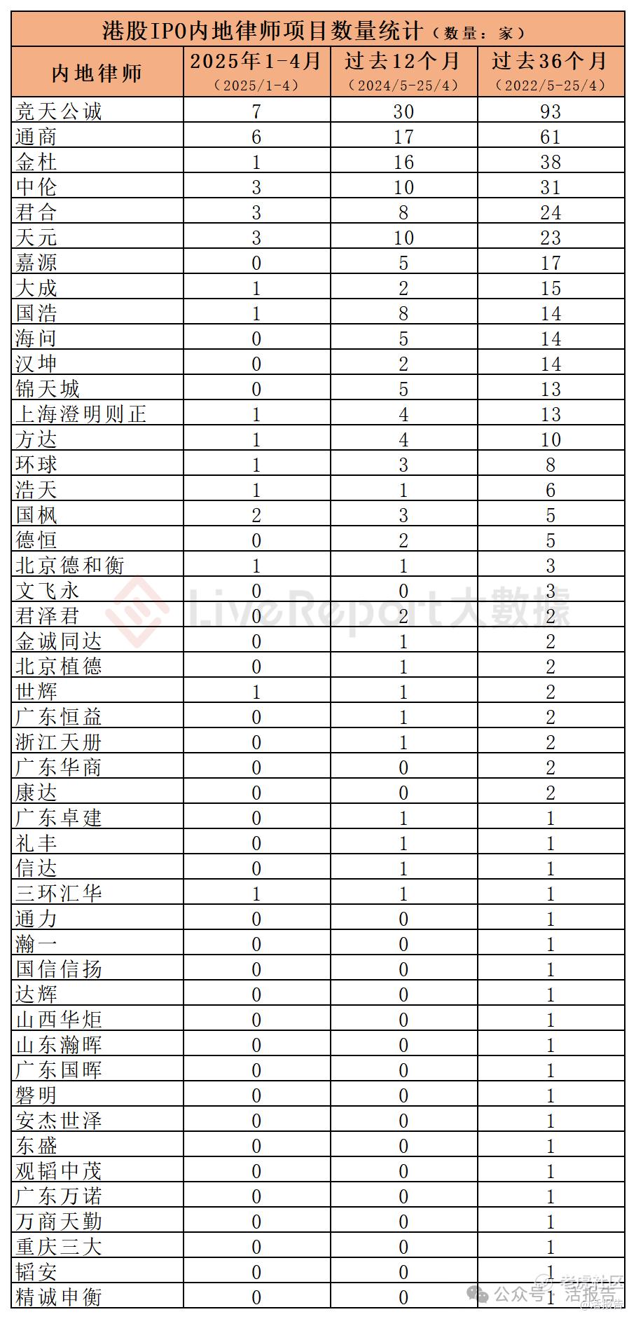 今年1-4月,16家内地律师为17家港股IPO提供了上市法律服务,项目数量最多的内地律师:① 竞天公诚(7家);② 通商(6家);③ 中伦、天元、君合(各3家)。