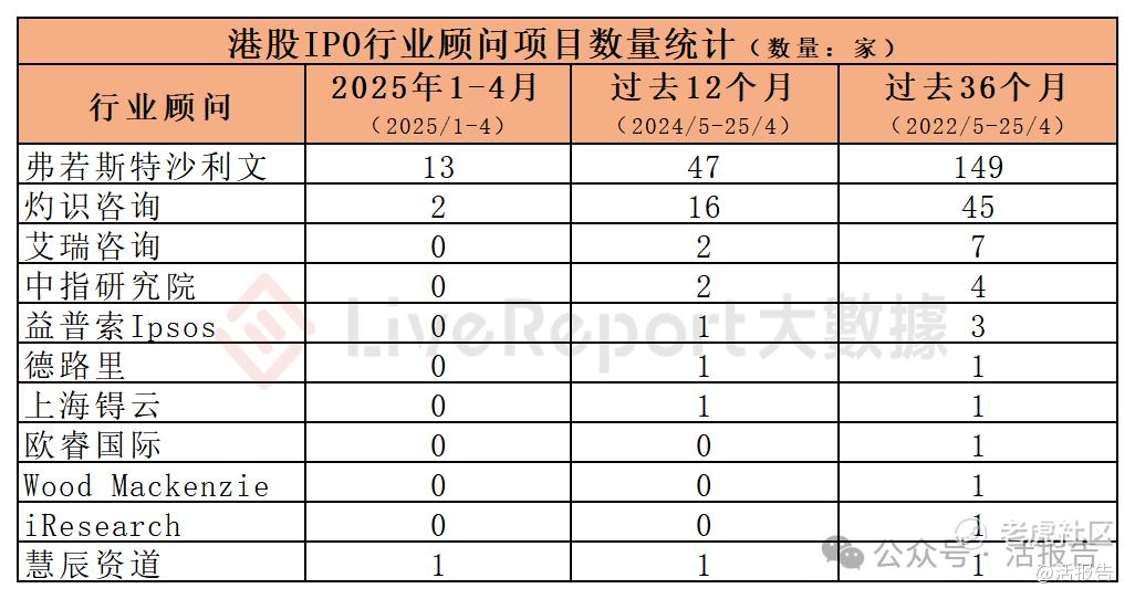 今年1-4月,以及过去12个月和36个月的统计期间,分别有3家、8家和11家行业顾问参与了港股IPO上市项目,各期间项目数量最多的行业顾问为: