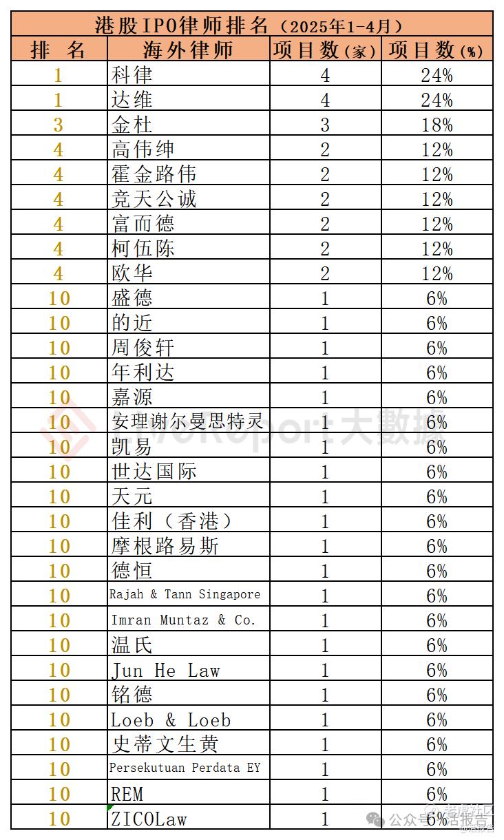 今年1-4月,31家海外律师为17家港股IPO提供了上市法律服务,项目数量最多的海外律师:①金杜、达维(各4家);③金杜(3家)。