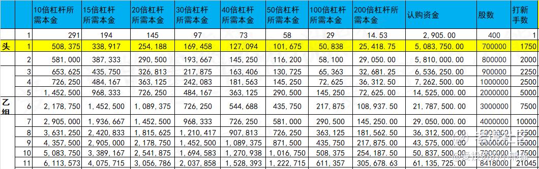 乙头需要认购资金509万,乙组的各档融资所需要的本金还有融资金额对应如下表: