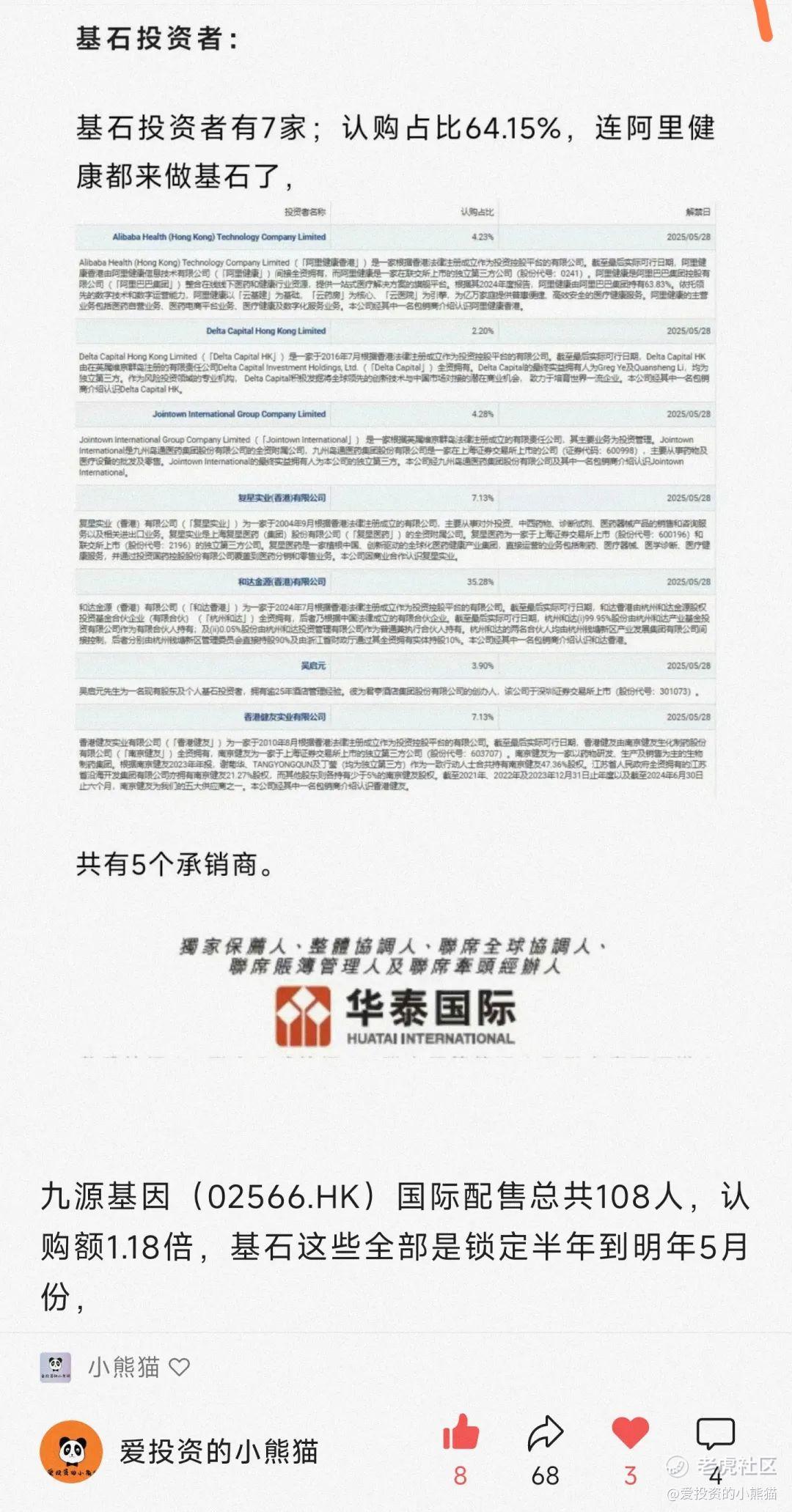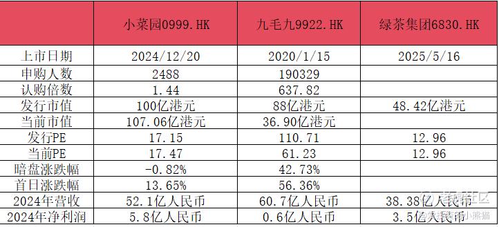 再说回绿茶这个票基石有56%, 实话说我并不觉得这是一个很好的比例,有时候真的不要觉得基石比例越高越好,看看以前荃信生物80%的基石比例反倒是比例越高走得越差,最后连港股通都没进,有时候恰到好处才是最好的安排。反倒是映恩生物和沪上阿姨那样。30%的基石比例在我看来是更加友好的。这个逻辑其实前面映恩和沪上阿姨招股期的时候在星球里面我也提过这个532架构的意思以及相对应的优势。这里就不再过多阐述了,这种50%以上的基石看上去比例很满,实际上很容易搞事情,暴涨或者暴跌的搞事情。回顾一下九源基因65%的基石比例,首日直接跌没了40%,结果玩了一个什么样的套路。