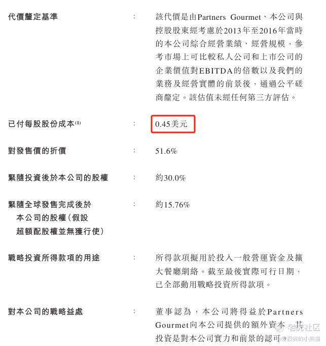 绿茶集团在 2017 年迎来了自成立以来的首次也是唯一一次战略性融资。Partners Gourmet(合众集团旗下基金)向其投入了大约 7063.12 万美元的资金,每股成本0.45美元(相当于3.50港元),获得了绿茶 30% 的股份。按此估算,在 2017 年时绿茶的估值达到 2.35 亿美元。这一估值对应 2023 年 3.03 亿元人民币经调整净利润的市盈率为 5.66 倍,相对偏低,基本上前期投资人成本可以忽略到不记。
