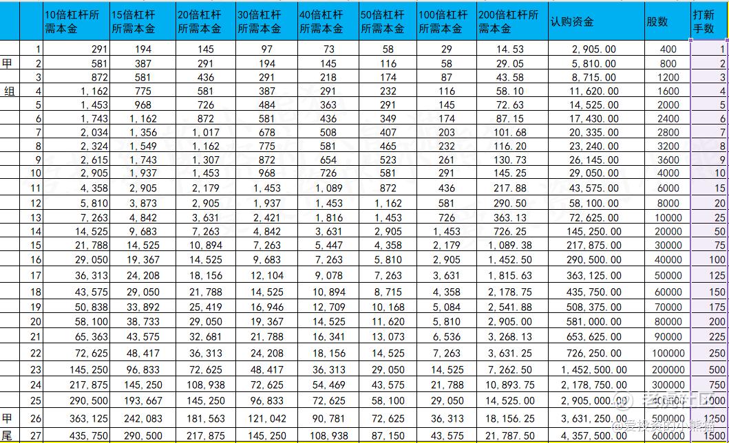 甲组的各档融资所需要的本金还有融资金额对应如下表: