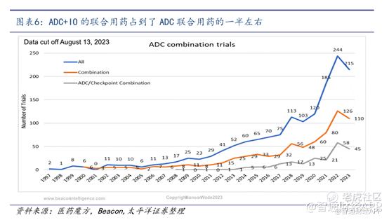 单药之外,越来越多的证据表明ADC对免疫治疗药物的疗效敏感,将免疫治疗与ADC相结合是目前临床实践的趋势。ADC 和IO两种药物从作用机制上具有较强的协同作用,同时不存在相互叠加的不良反应。根据Hanson Wade 数据库(截至2023年8月13日)显示:2022年启动的ADC临床研究达到244项,联合用药126项超过一半,其中ADC与IO的联合用药达到58项,占ADC联合用药的一半左右。