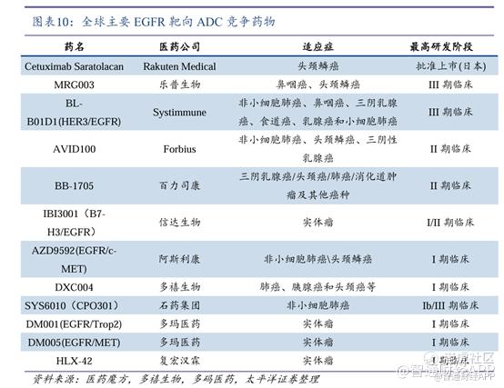 研发进展紧随其后的是乐普生物的MRG003以及百利天恒的EGFR×HER3双靶ADC BLB01D1,目前均处于Ⅲ期临床中,前者用于治疗鼻咽癌(NPC)和头颈鳞癌(HNSCC),后者用于治疗NPC、NSCLC等。除此之外,信达生物、阿斯利康、石药集团、复宏汉霖均有在研EGFR ADC药物,其中双抗ADC占据半壁江山。