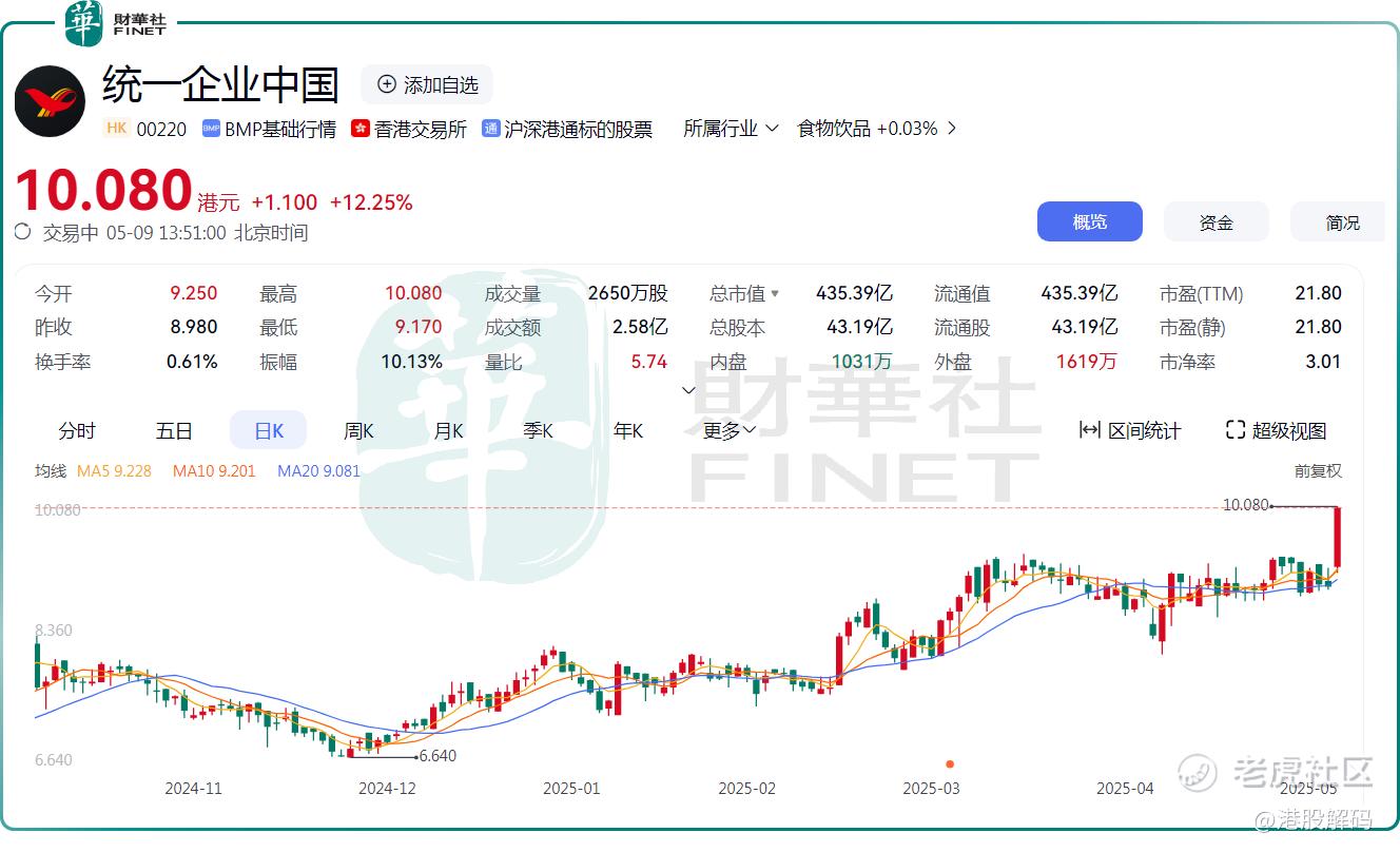 5月9日, $统一企业中国(00220)$ 股价大幅走高,截至发稿前,该股涨幅扩大至12.25%,报10.08港元/股。