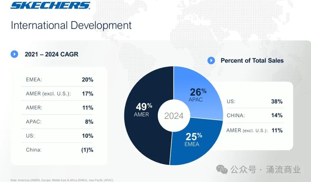 2025年4月24日,一季度数据公布后,斯凯奇首席运营官 David Weinberg 表示,季度销售额达到创纪录的24.1亿美元,批发和直接面向消费者DTC销售表现强劲,国际销售贡献了总收入的65%。欧洲、中东和非洲地区的销售额增长了14%,美洲销售额增长了8.3%。