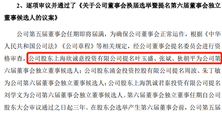 在早前第五届董事会第十九次会议决议会议上,欣诚意投资提名袁征、蔡仲曦、金诗强为公司第六届董事会非独立董事候选人;涌金投资提名王冲为公司第六届董事会非独立董事候选人;凯诚君泰提名惠一微为公司第六届董事会非独立董事候选人。