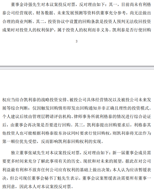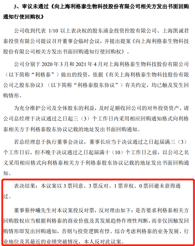 最近举行的第六届董事会第一次、第二次会议上,《向上海利格泰生物科技股份有限公司相关方发出书面回购通知行使回购权》仍旧未审议通过。