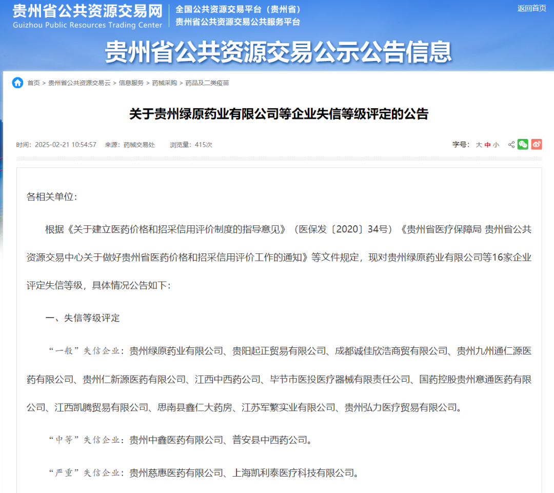 今年2月21日,贵州省公共资源交易中心发布公告,共有16家药械企业因为给予贵州省公立医疗机构回扣或不正当利益,被评级为一般失信企业、中等失信企业和严重失信企业。凯利泰,就是两家严重失信企业之一。
