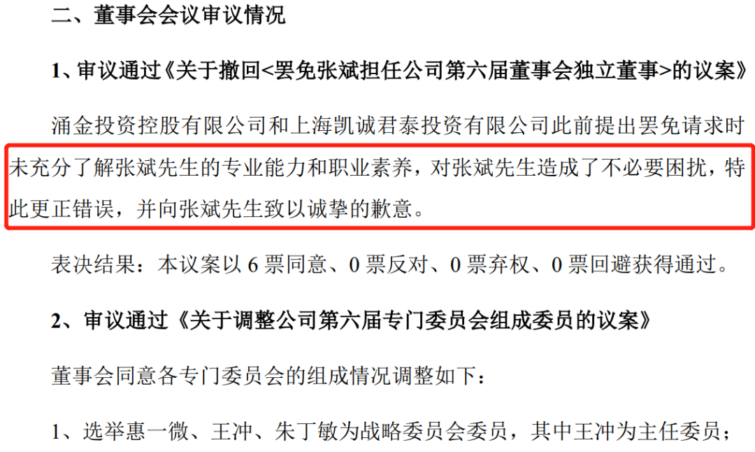 最新的,第一大股东涌金控股、第三大股东凯诚君泰对此前提议罢免独董张斌又反悔了,表示是他们是没有充分了解张斌的专业能力和职业素养,对后者造成了不必要困扰。现在,董事会已经审议通过《关于撤回的议案。不过,这名由第二大股东欣诚意提名的董事此前已经递交辞呈离开。