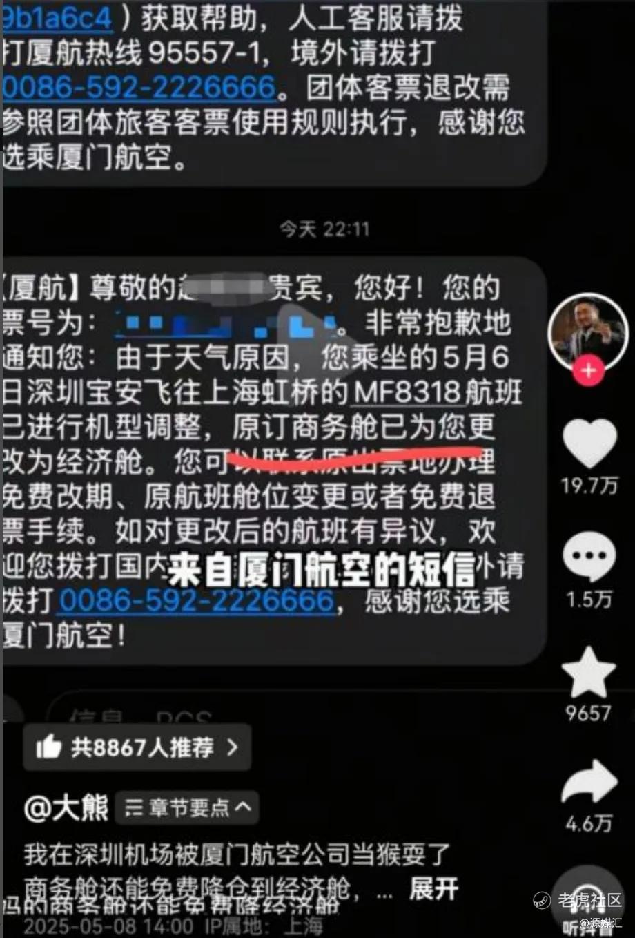 近日,抖音博主“大熊”在社交平台发布视频称,他5月6日乘坐厦门航空从深圳宝安飞往上海虹桥的MF8318航班时,遭遇人生中第一次“免费降舱”,引发广泛关注。