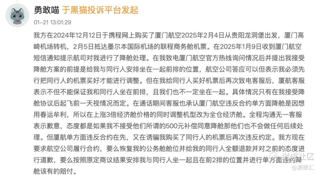 “大熊”的遭遇引发公众对厦门航空服务的广泛热议。据源媒汇了解,这已经不是厦门航空第一次因“免费降舱”遭遇质疑。