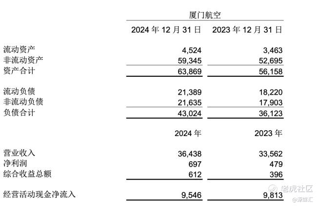 根据南方航空的业绩报告,2024年厦门航空营收同比增长8.57%至364.38亿元,净利润同比增长45.51%至6.97亿元。截至2024年12月31日,厦门航空总资产为638.69亿元。