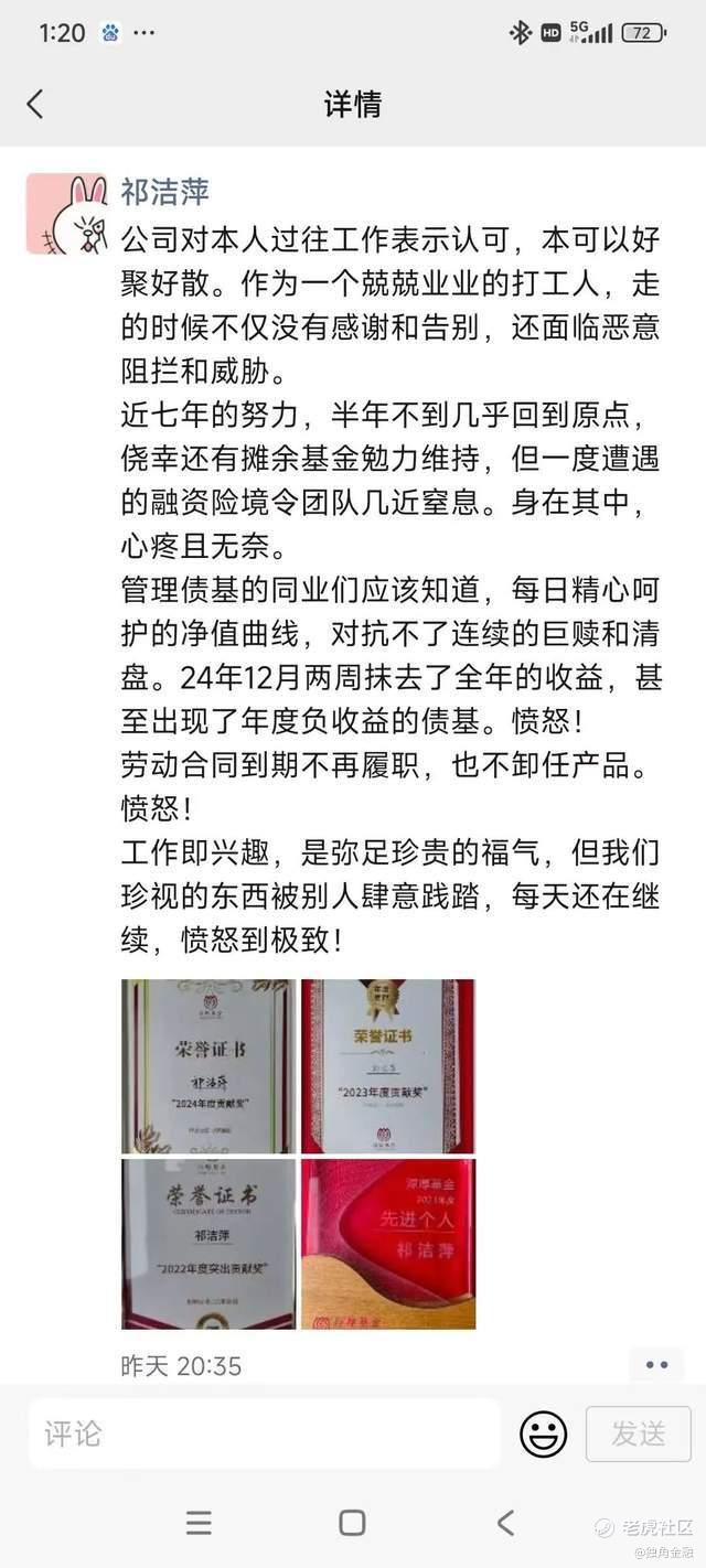 对此,淳厚基金回应称,祁洁萍与公司的合同应于2025年1月到期,2024年12月份公司与其商谈续签事宜,起初祁洁萍本人对此持同意态度,因合同中一些条款双方在此期间一直协商。2月初,祁洁萍也正常履职,不过合同一直未续签,从2月底开始,她与公司提出离职,公司表示理解,不过希望等公司股权纠纷解决后,即3-6个月时间公司再配合离职流程,但双方对此并未达成一致态度,祁本人坚持离职,2月底在公司提出离职后已不去公司,3月中旬,祁洁萍提出劳动合同诉讼,这种情况下公司也不再与祁洁萍继续沟通,双方开始走法律流程,此前该案已经开庭,而开庭后祁洁萍又撤诉,并在朋友圈发布关于离职未成的消息。