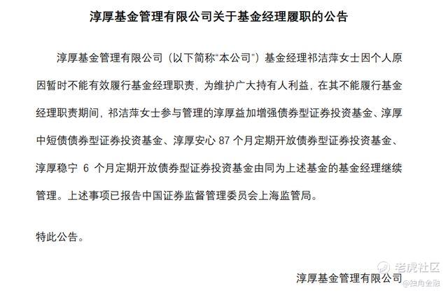 祁洁萍为淳厚基金总经理助理兼固定收益投资部总监,管理规模曾超过280亿元。在此次公告未发布前,祁洁萍曾提出离职,但因公司股权纠纷而未能离开。