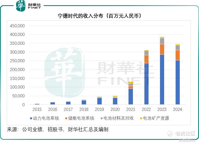 宁德时代主要从事动力电池、储能电池的研发、生产、销售。主要收入来自动力电池系统,2024年的收入贡献达2,530.41亿元(单位人民币,下同),占其总收入的69.90%;储能电池系统的2024年收入贡献为572.90亿元,占总收入的15.83%;电池材料及回收分部以及电池矿产资源分部于2024年的收入贡献则分别占到7.93%和1.52%。