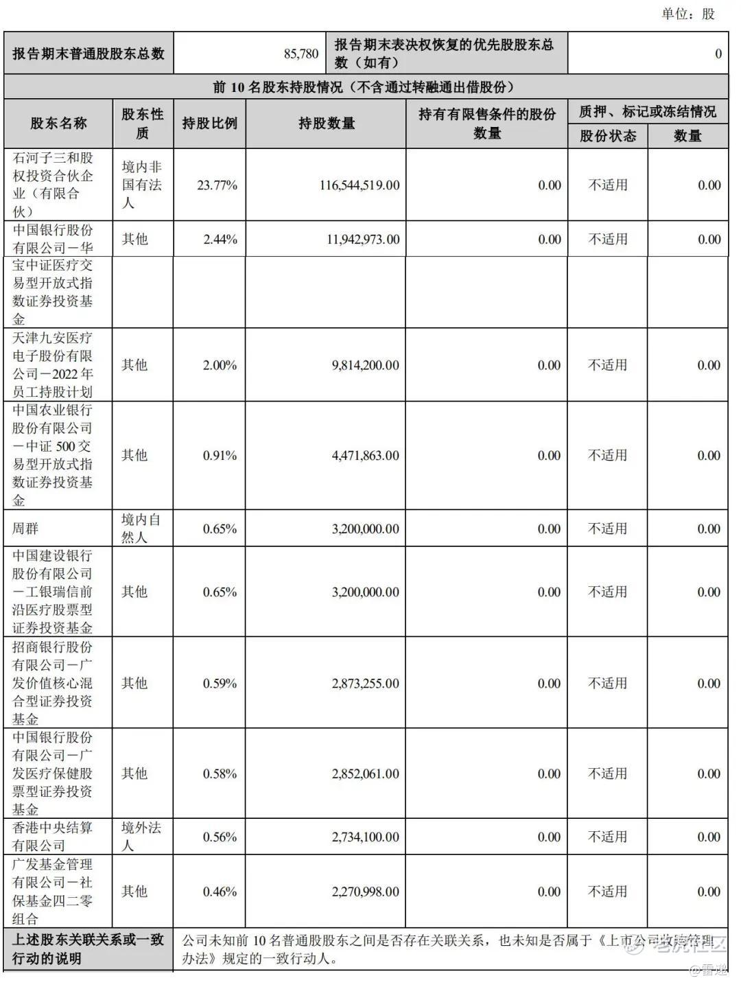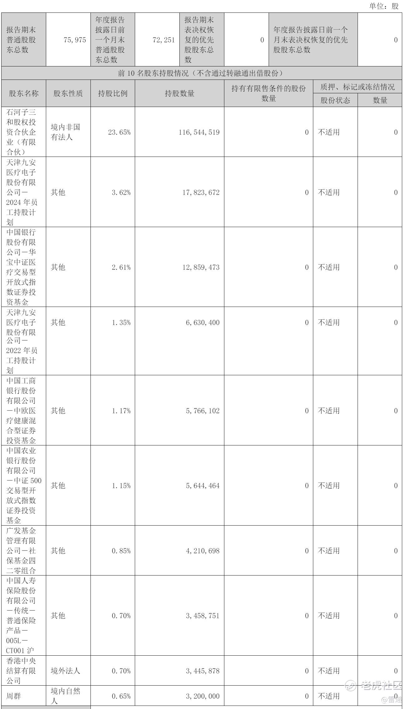 截至2024年12月31日,刘毅通过石河子三和股权投资合伙企业(有限合伙)持股为23.65%,天津九安医疗电子股份有限公司-2024 年员工持股计划持股为3.62%,中国银行股份有限公司-华宝中证医疗交易型开放式指数证券投资基金持股为2.61%;