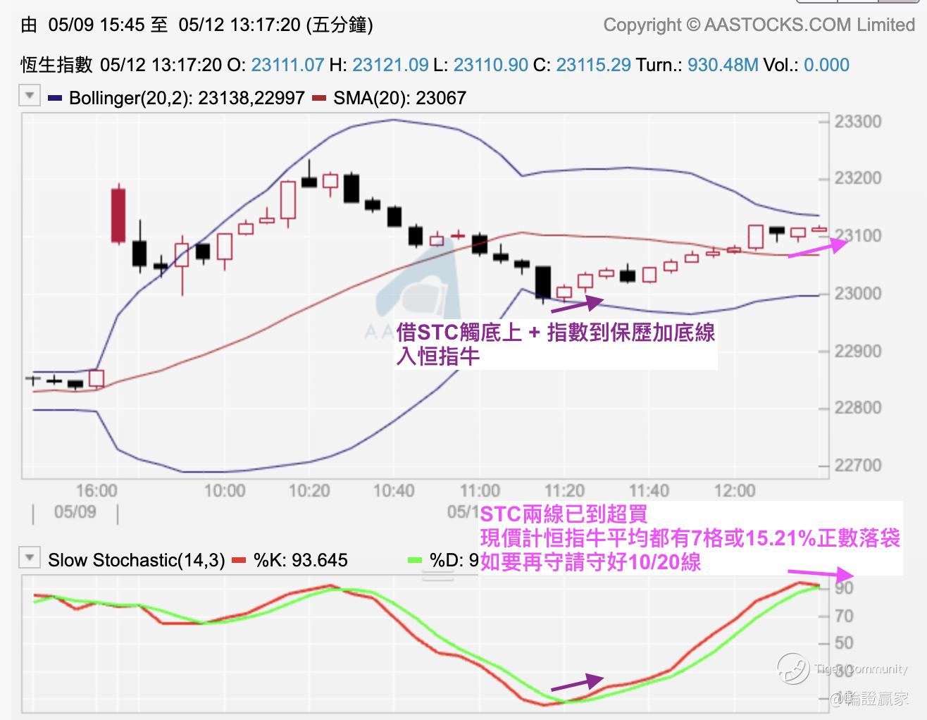 未几,五分钟图10线亦告失守,去到11点时再落到中轴线位兼随即向下,再退到保历加底线/Slow STC(14.3)到超卖出触底时,已经系11点20分,Well,既然系咁就用(69949)嚟做Slow STC(14.3)Swing Trade一趟啦,反正(69949)本身杠杆都够做。