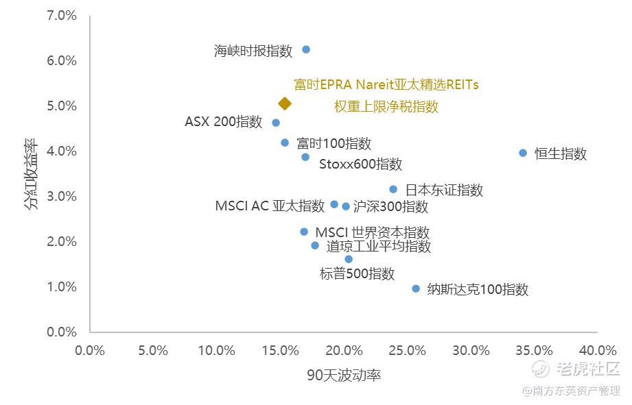 监管对分派率的强硬要求令高分红成为REITs资产的招牌特色。与其他主要权益类指数相比,亚太REITs的分红收益率相对较高,一般在3.9%-7.9%,且波动性较低(90天波动率为15.4%)。