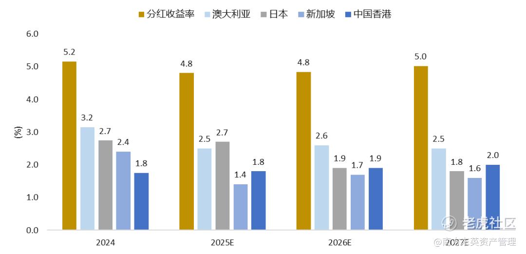 资料来源:南方东英,彭博,截至 2025/4/8。所有估计均来自彭博估计(BEst)。BEst分红收益率为富时EPRA Nareit亚太精选REITs权重上限净税指数。BEst分红收益率反映了对股息收益率的普遍预期。普遍预期是卖方分析师估值的平均值。正股息收益率并不意味着正回报。