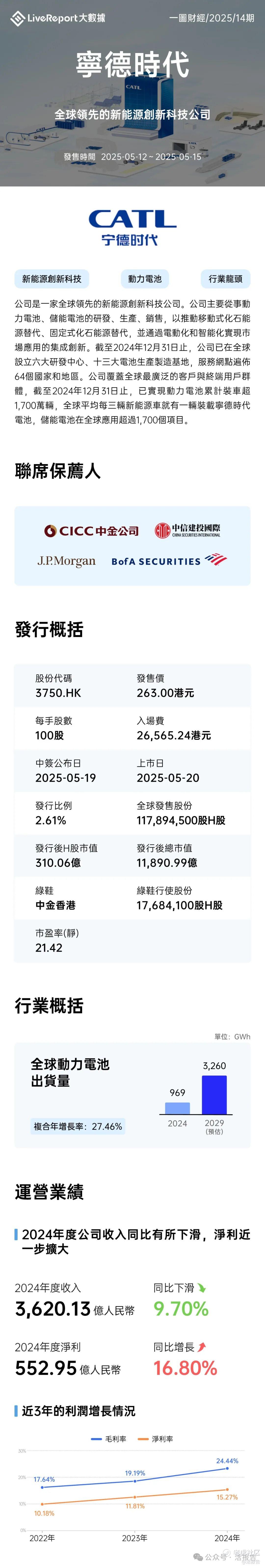 宁德时代(3750.HK)招股日期为2025年5月12日至2025年5月15日,并预计于2025年5月20日在港交所挂牌上市。