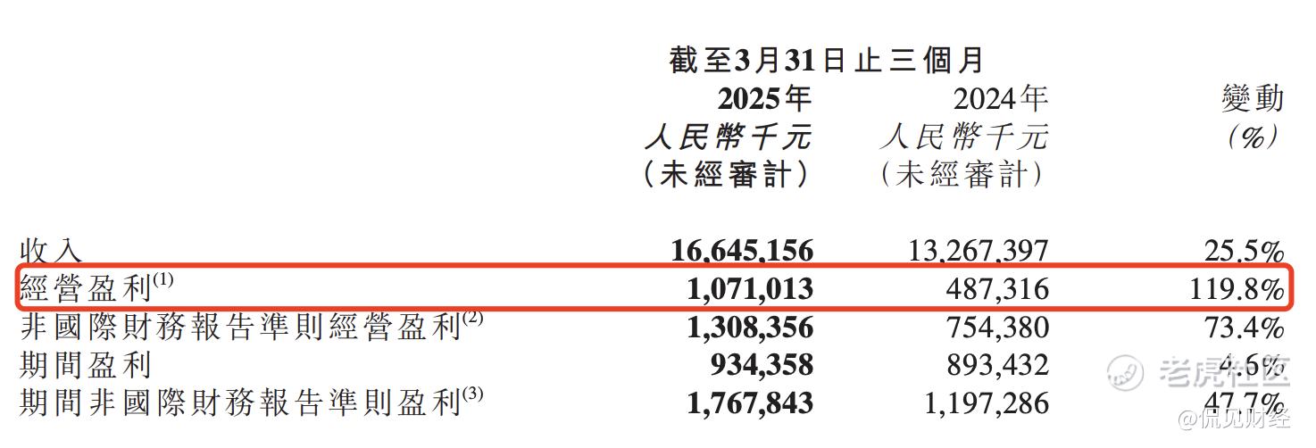 5月13日,医药电商龙头企业京东健康 $京东健康(06618)$ 发布了2025年一季度未经审计的财报,财报显示,Q1京东健康实现收入166.45亿,同比增长25.5%;经营盈利10.71亿元,同比暴增119.8%;非国际财务报告准则经营盈利为13.08亿元,同比增长73.4%。