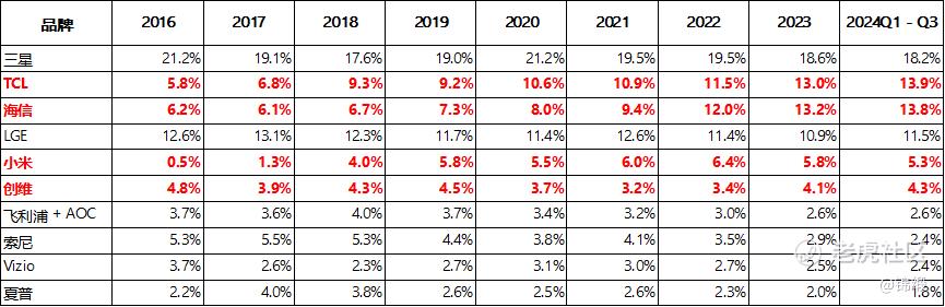 由于中国面板企业的性价比、技术优势,以及供货保障、供应链自主可控,带动中国黑电企业过去几年在全球份额高增(海信视象、TCL电子、小米等),超过三星也是指日可待。