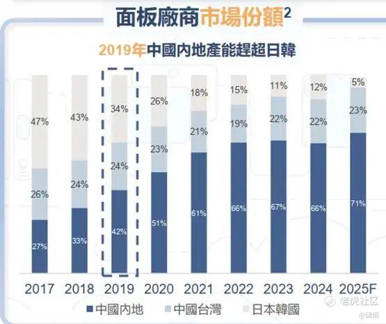目前中国大陆的面板产业,也正在贴近这个70%份额这条“黄金分割线”。