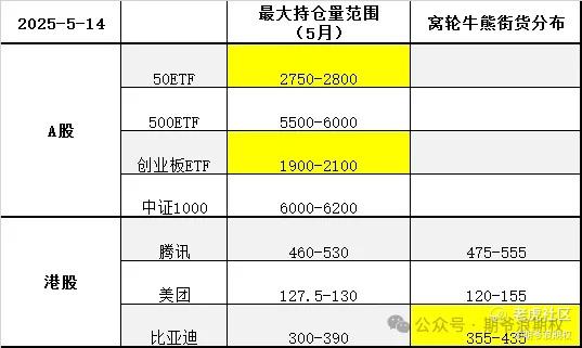 继续复盘,下图是富婆总结的,今天大A的3个ETF和一个指数,以及港股的腾讯、美团和比亚迪的最大持仓量范围以及窝轮牛熊分布范围,也就是5月的资金筹码分布,黄色的表示跟上个交易日有变动。