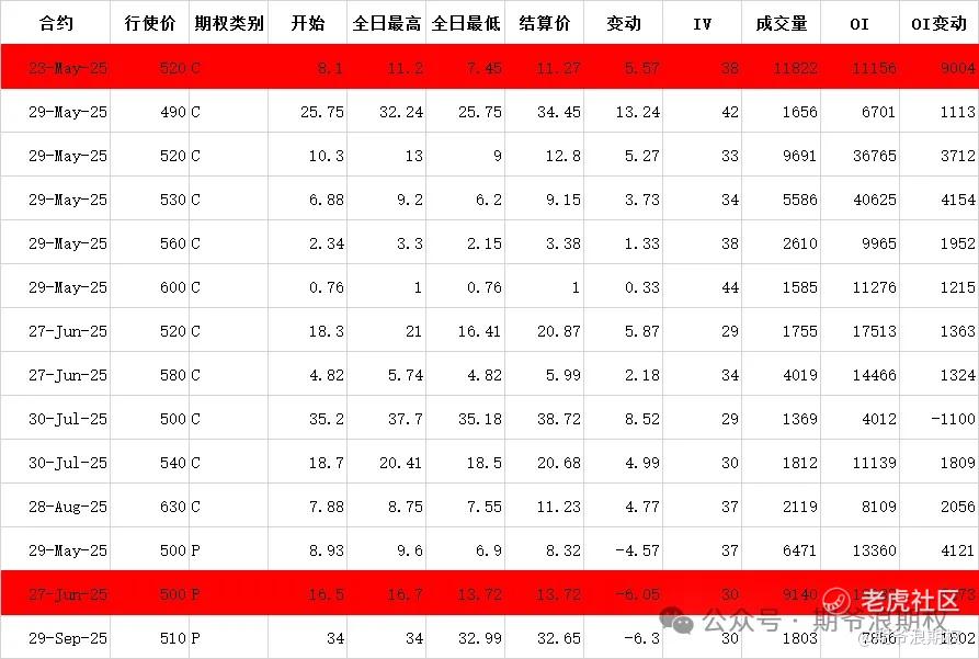 期权盘路非常活跃,下图是今天期权持仓变化较大的仓位,认购的比较多,主要是5-8月490-630的认购,还有5月和9月500的认沽。