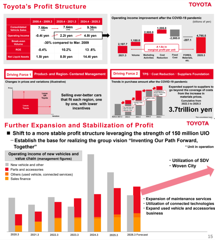 丰田价值链业务(如零部件、金融服务、二手车与维修)持续扩张,形成稳定利润池。2026财年该部分预计利润将首次突破2万亿日元。