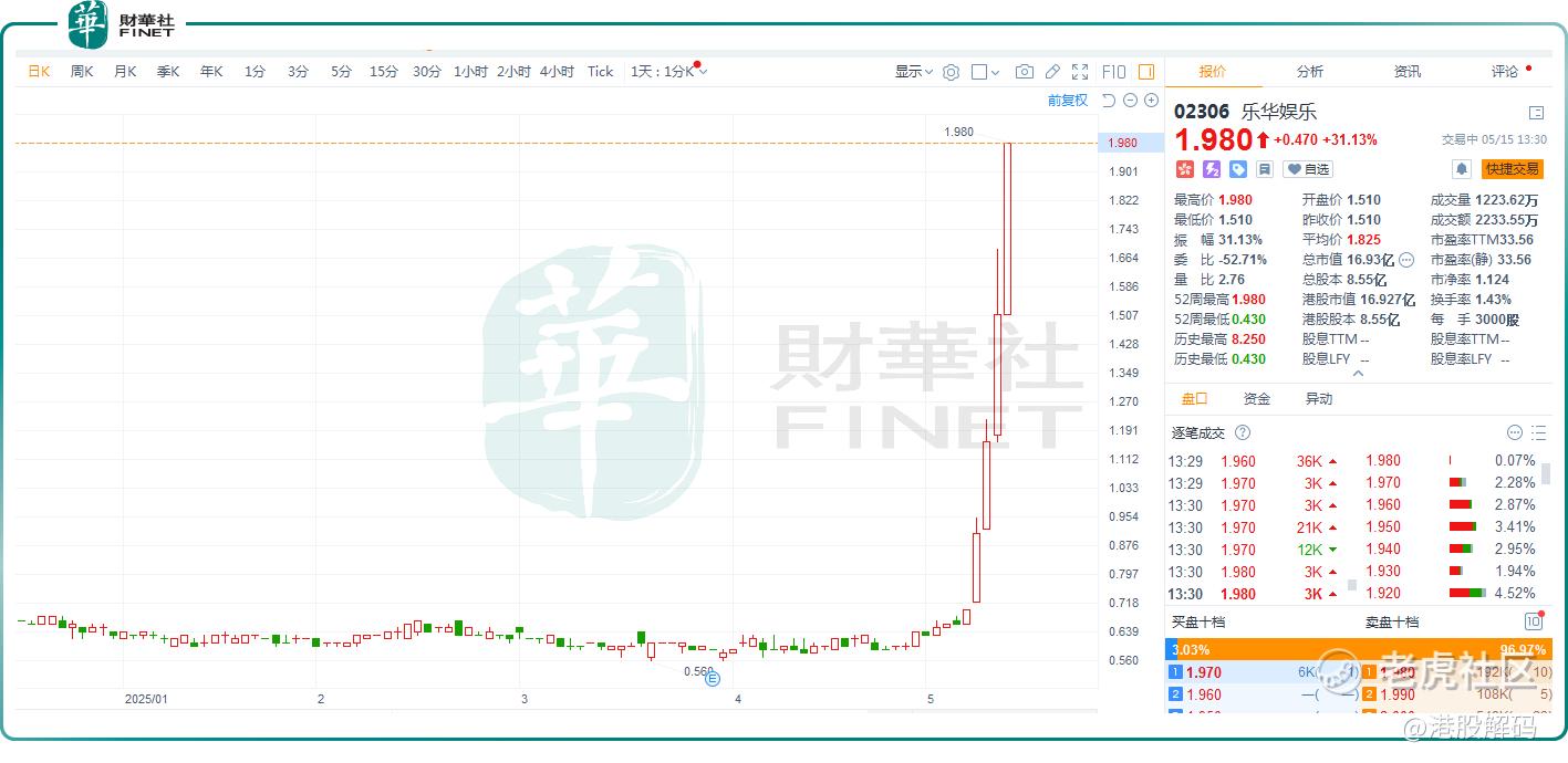 5月15日,港股“艺人管理第一股” $乐华娱乐(02306)$ 再度放量大涨,截至发稿前,涨幅达31.13%,报1.98港元/股,成功甩掉了“仙股”标签。自5月9日反弹迄今,该股累计涨幅约2倍。
