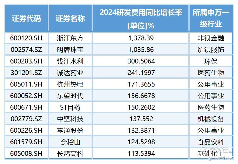 从投入增速看,2024年,浙股中有44家公司研发费用同比增长超过40%;有26家公司研发费用同比增长超过50%;11家公司研发费用同比增长超过100%,具体包括浙江东方、明牌珠宝、钱江水利、诚达药业、杭州热电、东望时代、ST目药、中坚科技、亨通股份、会稽山、长鸿高科。