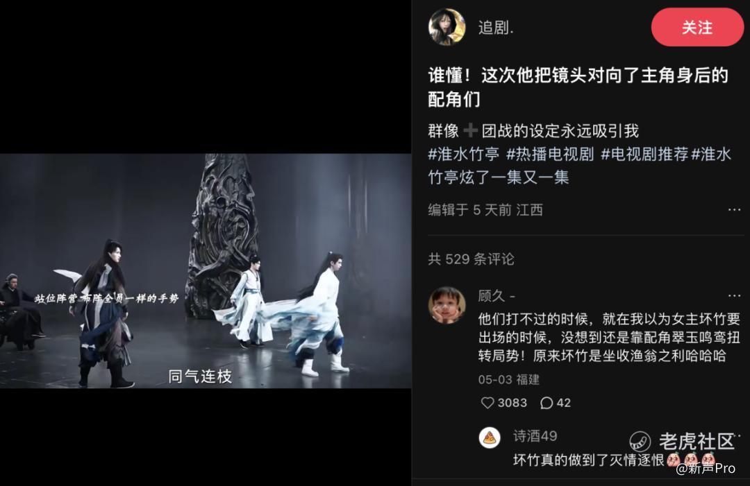 从剧迷的评价来看,这部剧丰富的侠义群像让观众产生了强烈的代入感。开篇「游戏感」十足的设计,后续环环相扣的剧情铺陈,都让剧迷有和角色们一起并肩作战的爽燃感。在剧集刚播出时,就有「请选择你的淮水竹亭英雄」的话题,后续,粉丝也乐于用「MVP结算画面」「群像热血番」来剪辑他们的打戏片段。