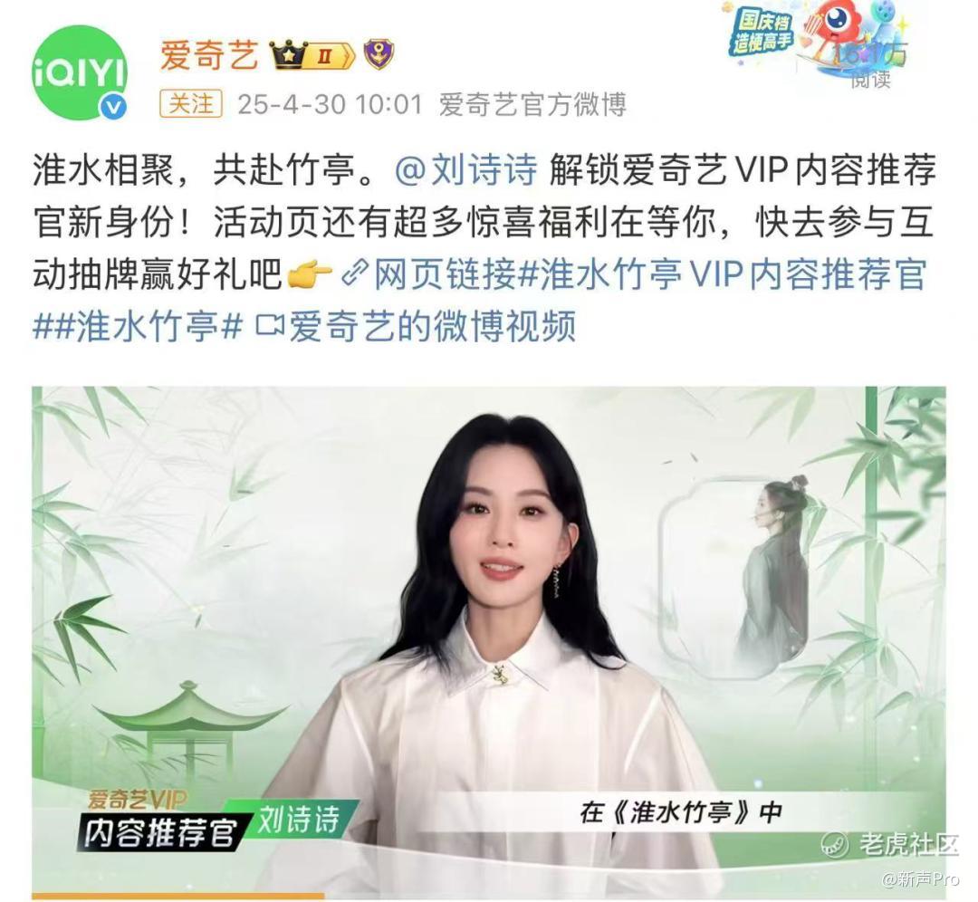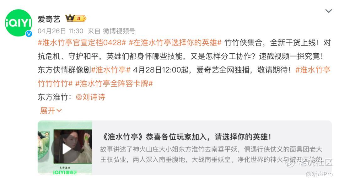 早在开播前的爱奇艺世界大会,《淮水竹亭》就登上了微博剧集影响力待播榜TOP1,「刘诗诗新剧拍出淮竹的只此青绿」「刘诗诗一秒入戏落泪」「刘诗诗新剧不会琴棋书画擅长斗法打架」就登上了微博热搜。4月30日,爱奇艺趁热官宣刘诗诗为爱奇艺VIP内容推荐官。