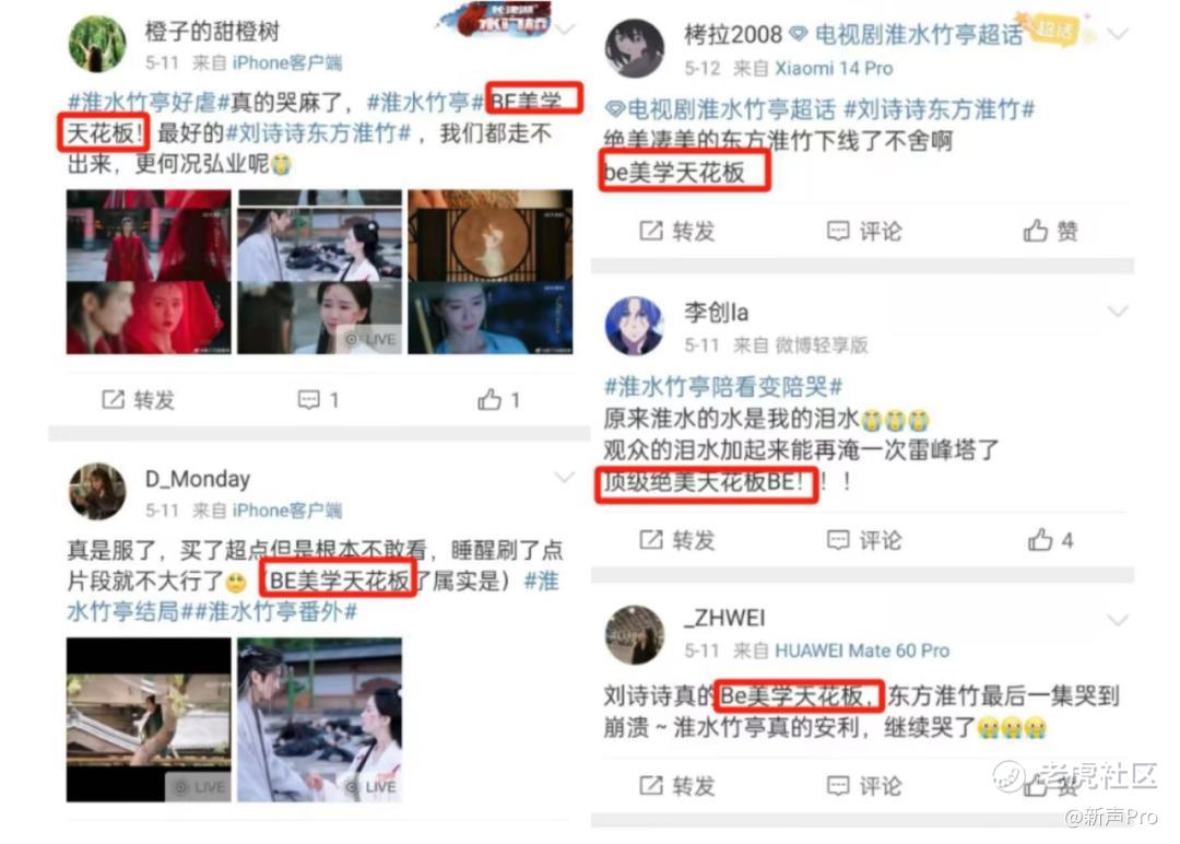这种持续的影响力溢出很难仅依靠单个热点话题的爆发实现,《淮水竹亭》聚集了一批高粘性的剧粉,发酵出了高质量且独特的UGC生态。对群像的成功塑造让《淮水竹亭》在剧情后段,甚至激发了更多用户深度讨论。不少人持续在「淮水竹亭极致BE美学」的话题下,讨论着「面具团」那些让人心碎的结局:「开局一群人,结局一堆坟」「周而复始 结局还是失去你……」「三天了还没从淮水竹亭走出来」。