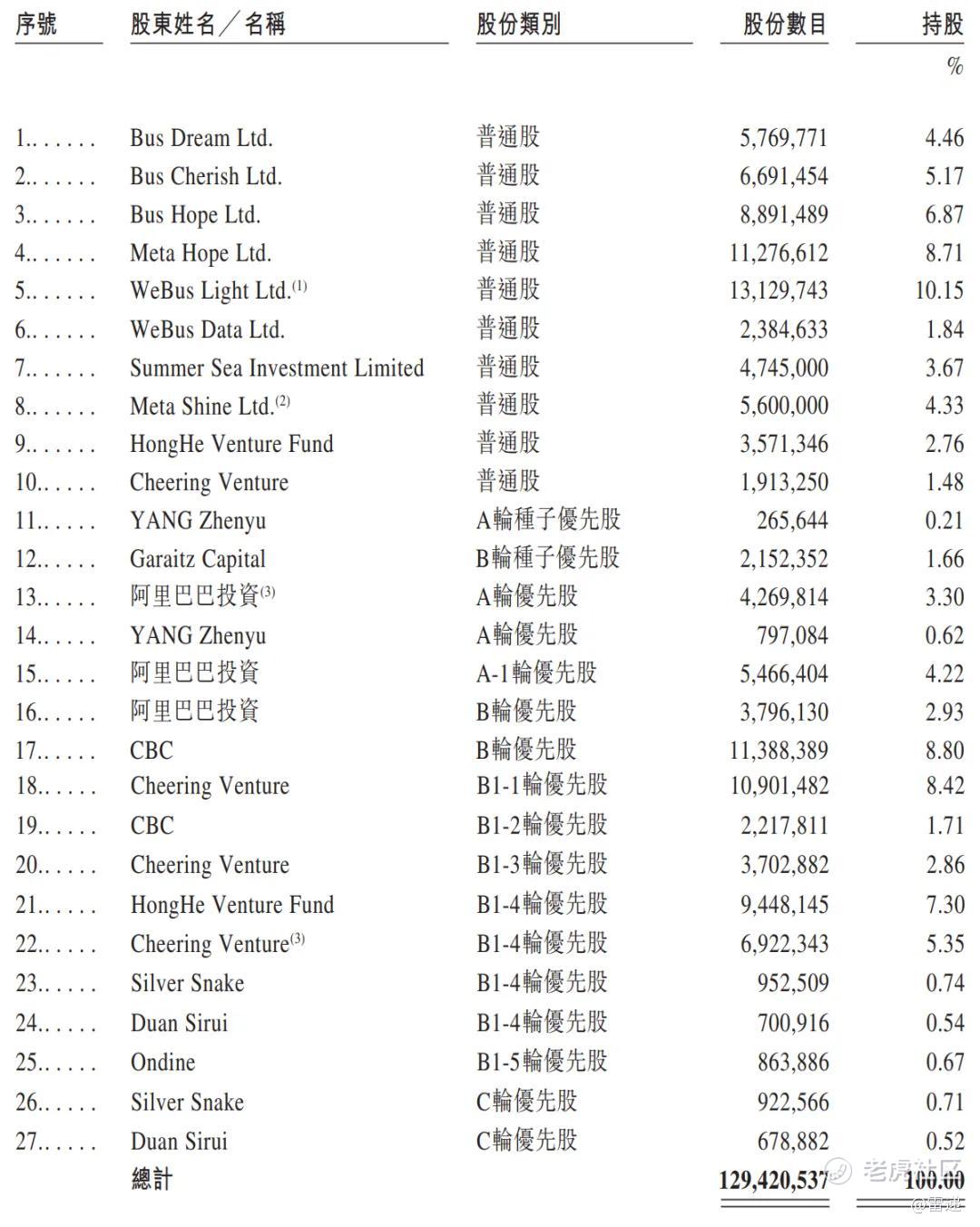 杨正宏旗下HongHe Venture持股10.06%,滴滴旗下Cheering Venture持股18.11%,阿里持股10.46%,田溯宁旗下China Broadband Capital持股为10.51%。