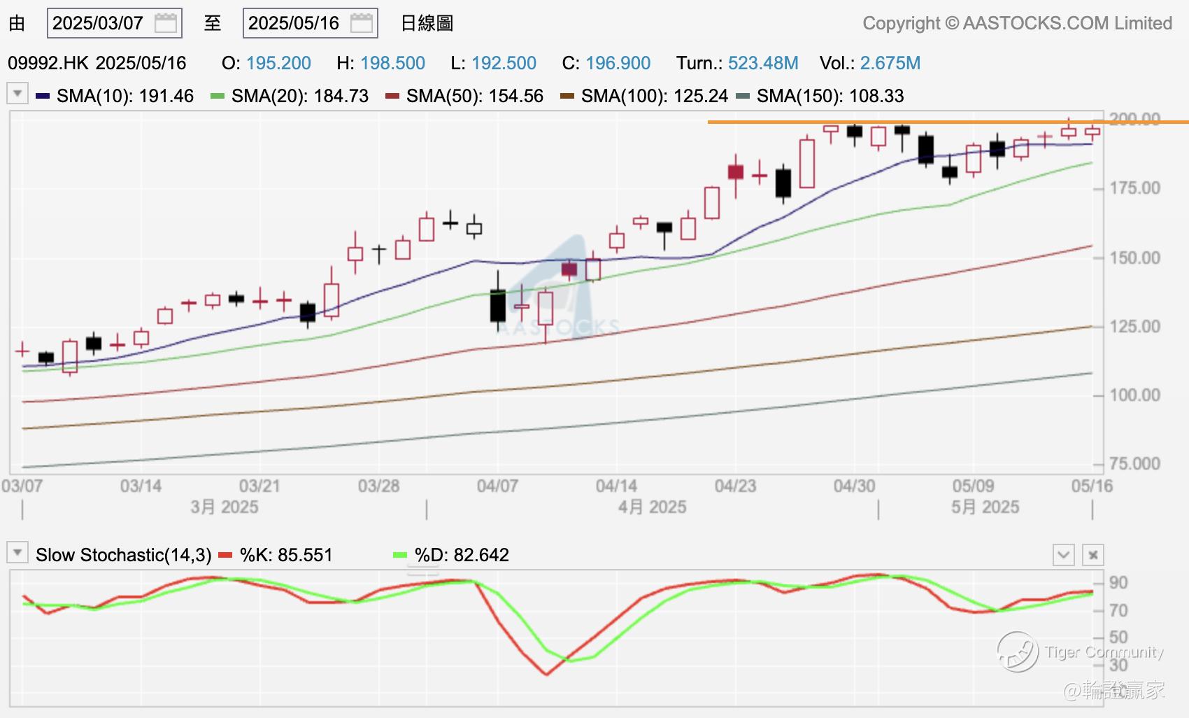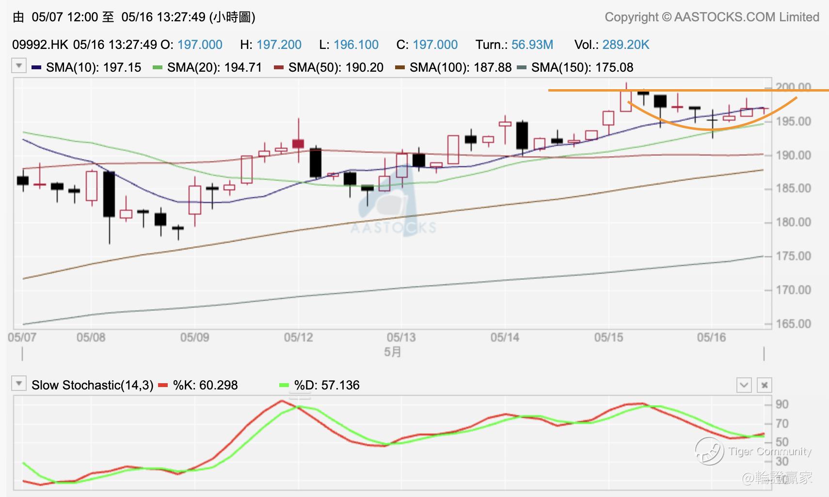 换个小时图上见股价目前目都仲卡住喺10/20线之间,不过Slow STC(14.3)两线就喺中轴水平有见转向上,乃念佢20线都接得几稳,「圆底」样有得画到,颈线mark住200蚊呢个位先。