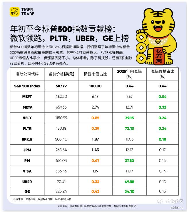 小虎老师帮大家整理出来了2025年初至今对标普500指数综合贡献最高的10只股票,其中 $微软(MSFT)$ 贡献最大, $Meta Platforms, Inc.(META)$ 排第二, 大家都压中了吗 [鬼脸]