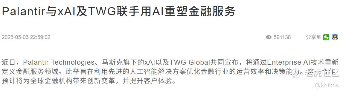 - 合作与创新:Palantir宣布与xAI和TWG Global合作,将人工智能整合到金融服务中,旨在提升该板块的竞争力。