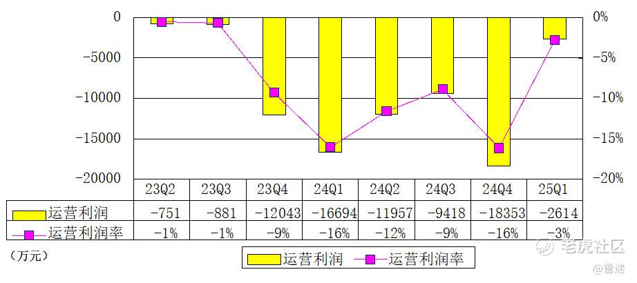 斗鱼2025年第一季度运营亏损为2614万元,较上年同期的运营亏损1.67亿元收窄84.3%。斗鱼2025年第一季度运营利润率为-3%。