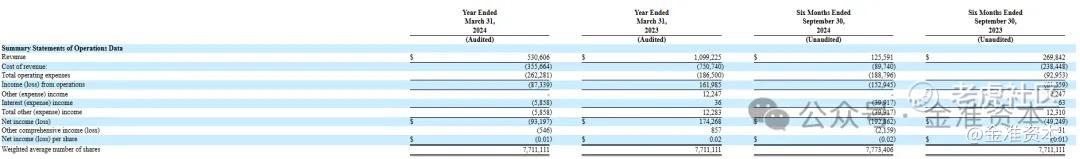 招股书显示,截止2024年9月30日的六个月,公司实现收入12.5万美金,净亏损19.2万美金。