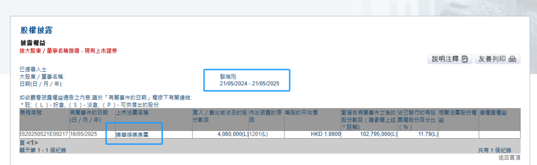 港交所股权披露显示,黎瑞刚于5月16日减持乐华娱乐(02306.HK)408万股,均价1.89港元、套现,目前其持股由12.26%降至11.79%。