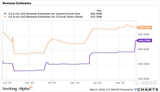 分析师普遍预计,从现在起到 2027 财年,公司营收将每年增长约 20%,达到 5.52 亿美元。C3.ai 将在未来两年内增加约 1.64 亿美元的额外收入,与正在进行的协议相比,这些数字看起来非常保守。