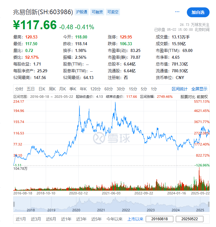 兆易创新,于2016年8月18日在深交所上市,截至周四(5月22日)收市,每股收报117.66元,目前总市值约 781.33亿元。