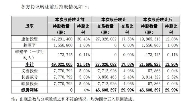 A股上市企业绿康生化(002868.SZ)发布公告,公司四大股东康怡投资、义睿投资、长鑫贰号、皓赢投资拟向纵腾网络转让上市公司46,608,397股普通股股份,占上市公司总股本的29.99%的股份。本次股份转让完成后,纵腾网络持有上市公司股份46,608,397股,占公司总股本的29.99%,交易完成后,公司控股股东将由康怡投资变更为福建纵腾网络有限公司(纵腾网络),实际控制人将由赖潭平变更为王钻。